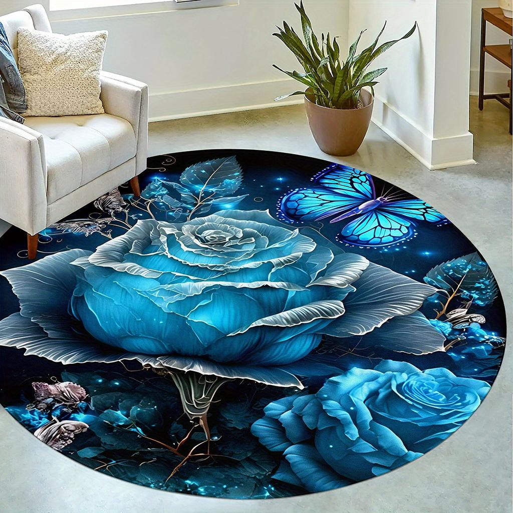 Luxurious Blue Floral and Butterfly Pattern Round Shape Floor Mats Kitchen Hallway Runner Rug Bedroom Living Room Soft Carpet Non-slip Area Rug