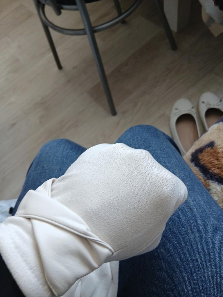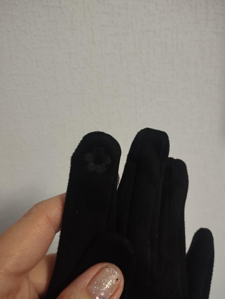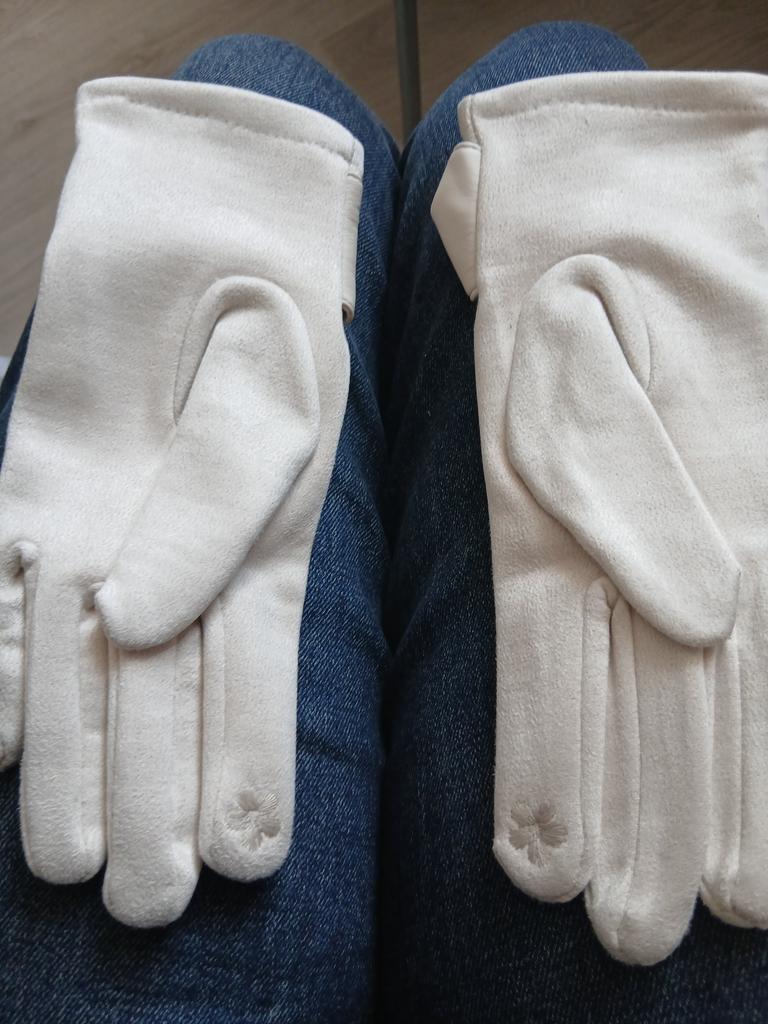 Color - milky silver. The fabric is soft, pleasant (even very). A small flower is embroidered on the index finger of the glove (to press on the phone).