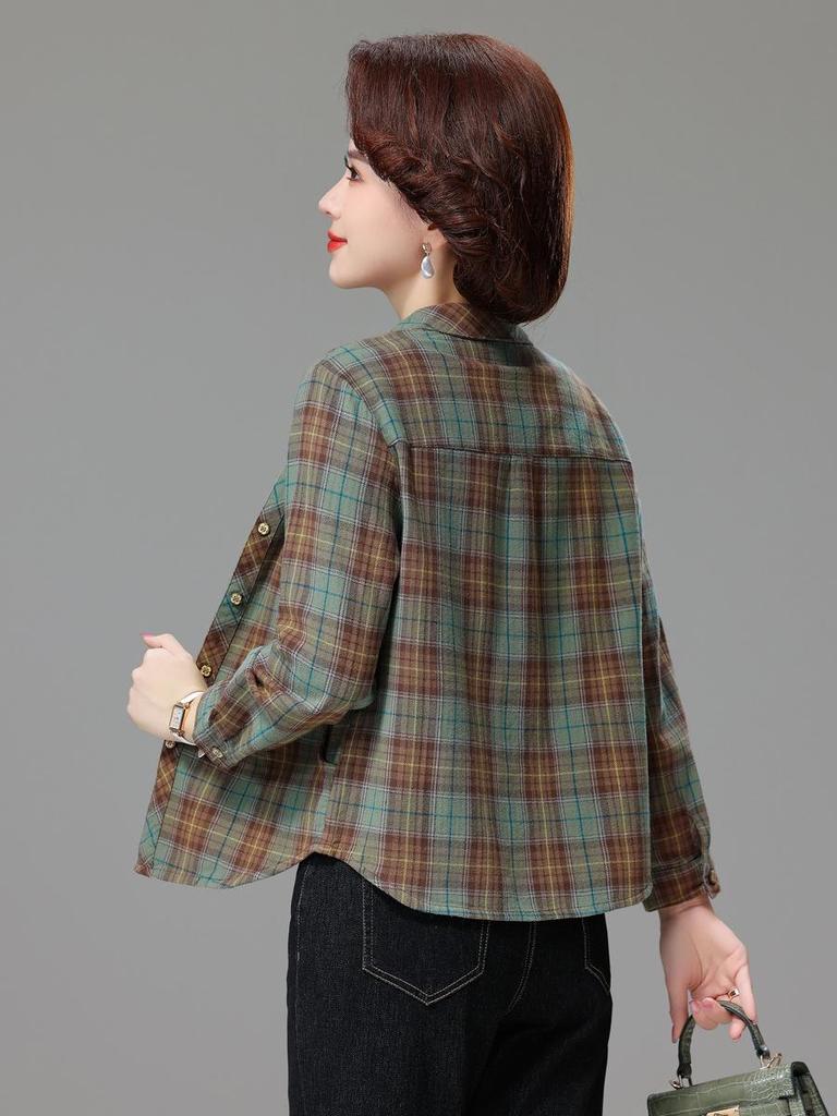 Embrace the cozy elegance of the season with this stylish plaid cotton shirt, designed specifically for middle-aged and elderly women. Crafted from a unique combination of threaded cotton and PVC, this shirt offers a comfortable yet durable wear. The classic plaid pattern brings a timeless appeal, while the long sleeves ensure warmth during the cooler months. Featuring a turn-down collar, this shirt effortlessly blends sophistication with a relaxed, laid-back charm, making it an ideal addition to any autumn wardrobe.