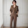 Elevate your business wardrobe with this sophisticated three-piece set crafted from luxurious lyocell material. Designed for the modern woman, this ensemble features a solid dark brown blazer and matching wide-leg pants, offering a perfect blend of elegance and comfort. The blazer is adorned with practical pockets, adding a functional touch to its sleek silhouette. With its sportive style, this versatile set seamlessly transitions from the office to after-hours, making it an essential addition to any professional collection.