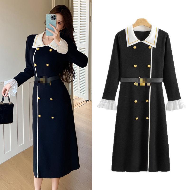 Nanyou 2025 Fall/Winter Women's Colorblock Knitted Dress with Metal Buckle and Long Sleeves