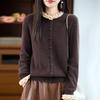Elevate your fall and winter wardrobe with this elegant cardigan sweater, crafted from high-quality wool for warmth and comfort. This long-sleeve knit features a stylish color block design complemented by delicate lace and unique wood ear details, adding a touch of sophistication to your look. With a secure button closure, it offers both practicality and chic style, making it a versatile addition to your seasonal attire.
