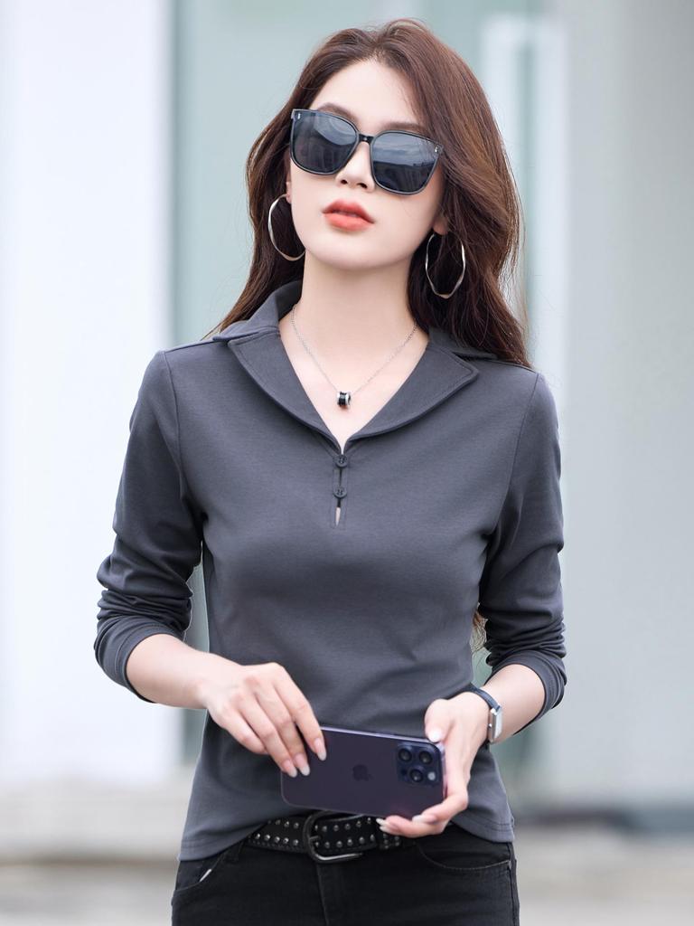Introducing the perfect addition to your autumn wardrobe: a versatile fashion top crafted for style and comfort. Made from high-quality cotton material, this long sleeve t-shirt features a sophisticated turn-down collar and a streamlined, slimming silhouette. Its solid pattern and tailored neckline offer a touch of elegance, making it an ideal choice for both casual and semi-formal occasions. Whether you're dressing up for a day at the office or enjoying a casual outing, this top promises to keep you looking chic and stylish throughout the season.