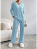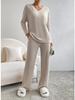 Discover effortless elegance with this autumn ensemble, crafted for the modern woman. The set features a rib-knit V-neck top paired with casual straight-leg pants, exuding a relaxed yet refined style. Available in delightful macaron colors, it adds a soft, inviting touch to your seasonal wardrobe. Made entirely from high-quality polyester, this solid-patterned outfit ensures both comfort and durability, making it an ideal choice for versatile casual wear.