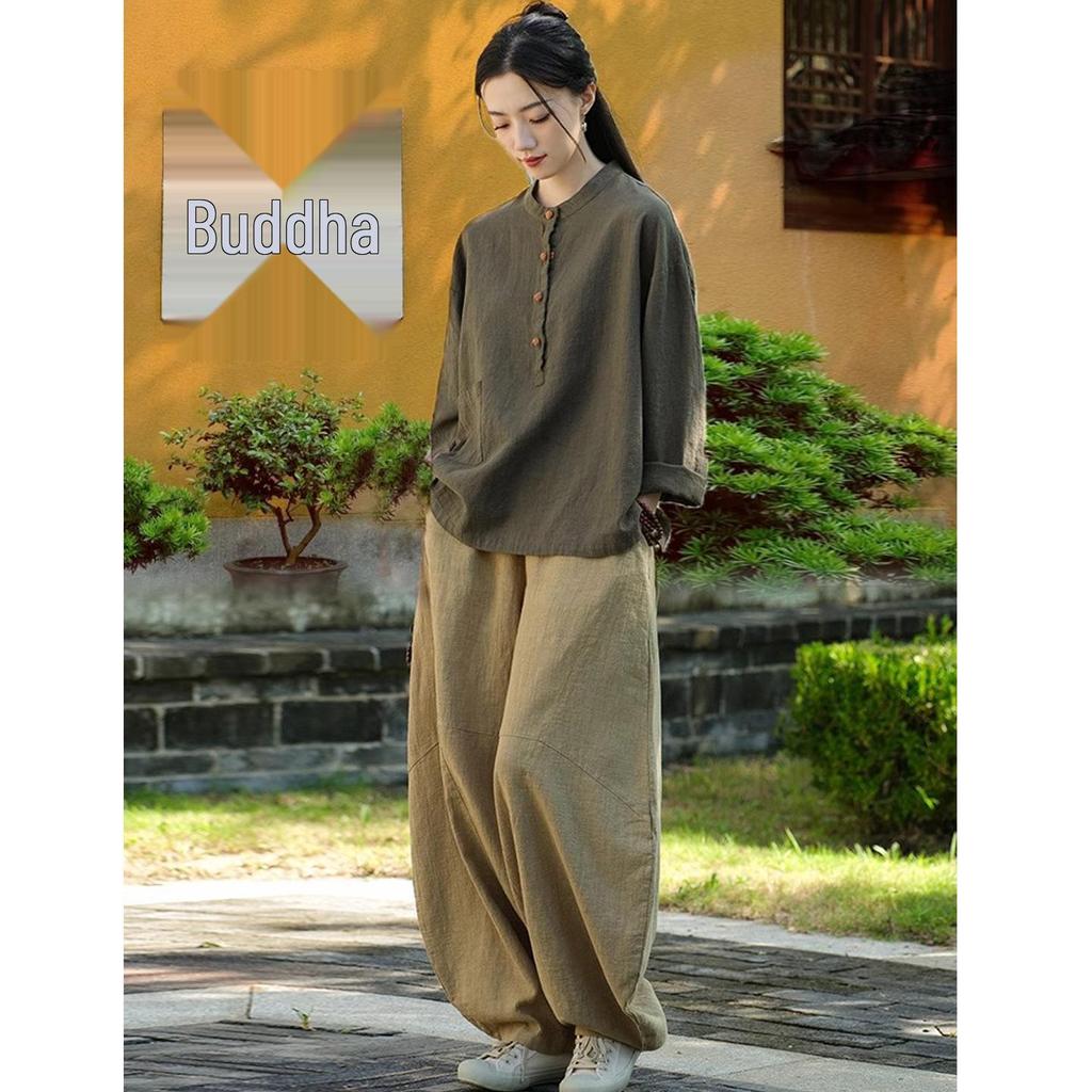 Women's Cotton Linen Zen Meditation Suit with Frog Button Shirt