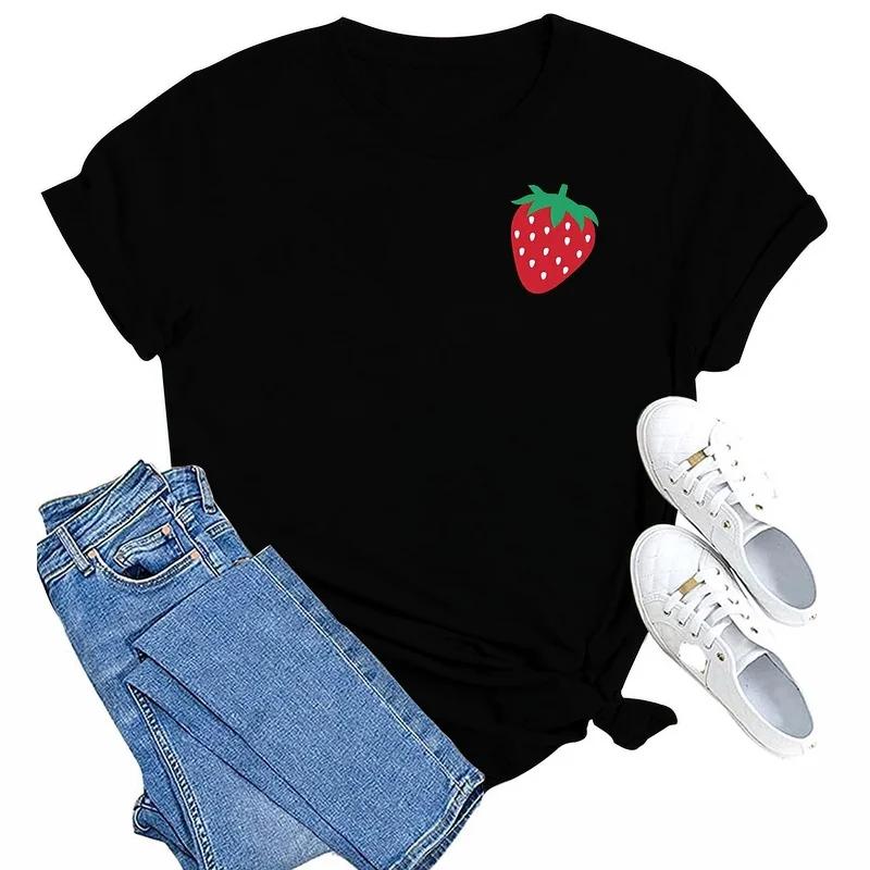 Women's Strawberry Pattern Print Spring and Summer Cotton T-shirt Women's Casual Round Neck Short-sleeved Versatile Top