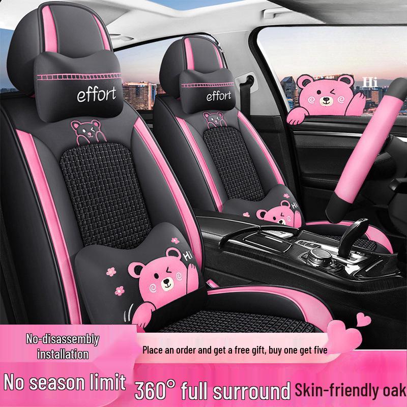 Universal Full Surround Car Seat Cover - Four Seasons Leather & Summer Ice Silk with Cartoon Design