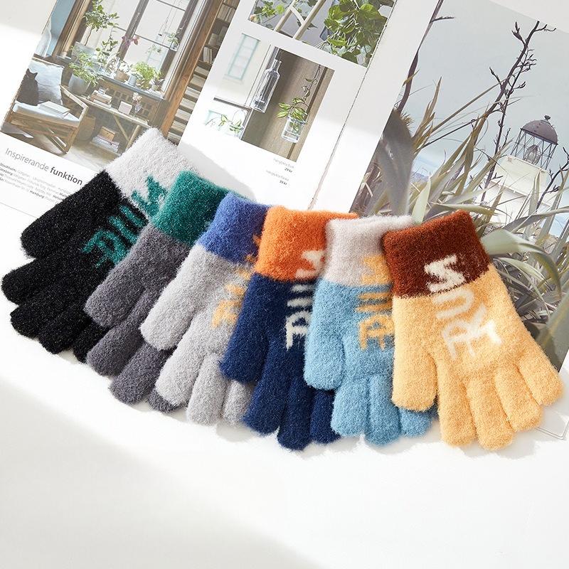 Children's Winter Warm Gloves New Full Finger Alphabet Jacquard Boy's Five Finger Cute Student Knitted Split Finger