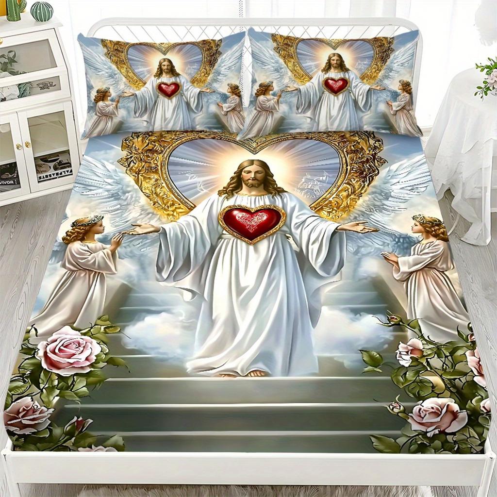 3pcs Bedding Set with a Religious Pattern Featuring Sacred Heart Angels Including a Fitted Sheet And Two Pillowcases