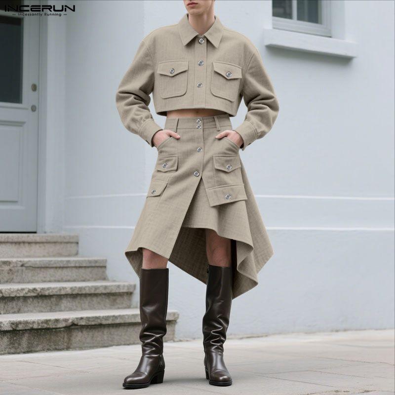 INCERUN Women Men Long Sleeve Cropped Tops and Irregular Skirts Sets Outfits
