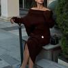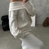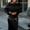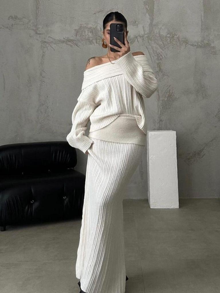 Embrace elegance and comfort with this luxurious two-piece set, featuring an off-the-shoulder knitted sweater paired with a matching skirt. Crafted entirely from high-quality cashmere, this ensemble offers exceptional softness and warmth, making it a perfect choice for cooler seasons. The long sleeves add a touch of sophistication, while the off-the-shoulder design provides a chic, modern flair. Ideal for both European and American style enthusiasts, this set effortlessly combines style and comfort, suitable for any occasion.