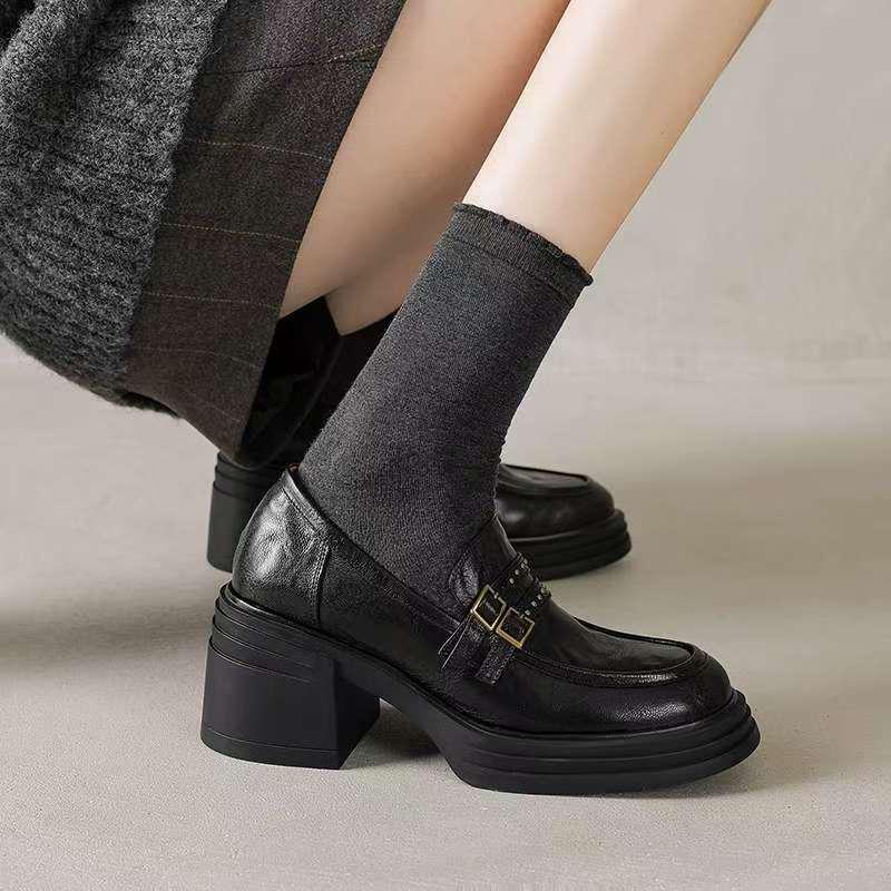Elevate your style with these women's chunky heel loafers, perfect for the 2025 autumn and winter seasons. Crafted from genuine leather, these loafers combine elegance and durability. The thick rubber soles provide excellent grip and comfort, making them ideal for versatile wear. Inside, the polyurethane lining and insole ensure a cozy and snug fit, keeping your feet comfortable throughout the day. Designed for those who appreciate both fashion and function, these petite shoes effortlessly complement any wardrobe.