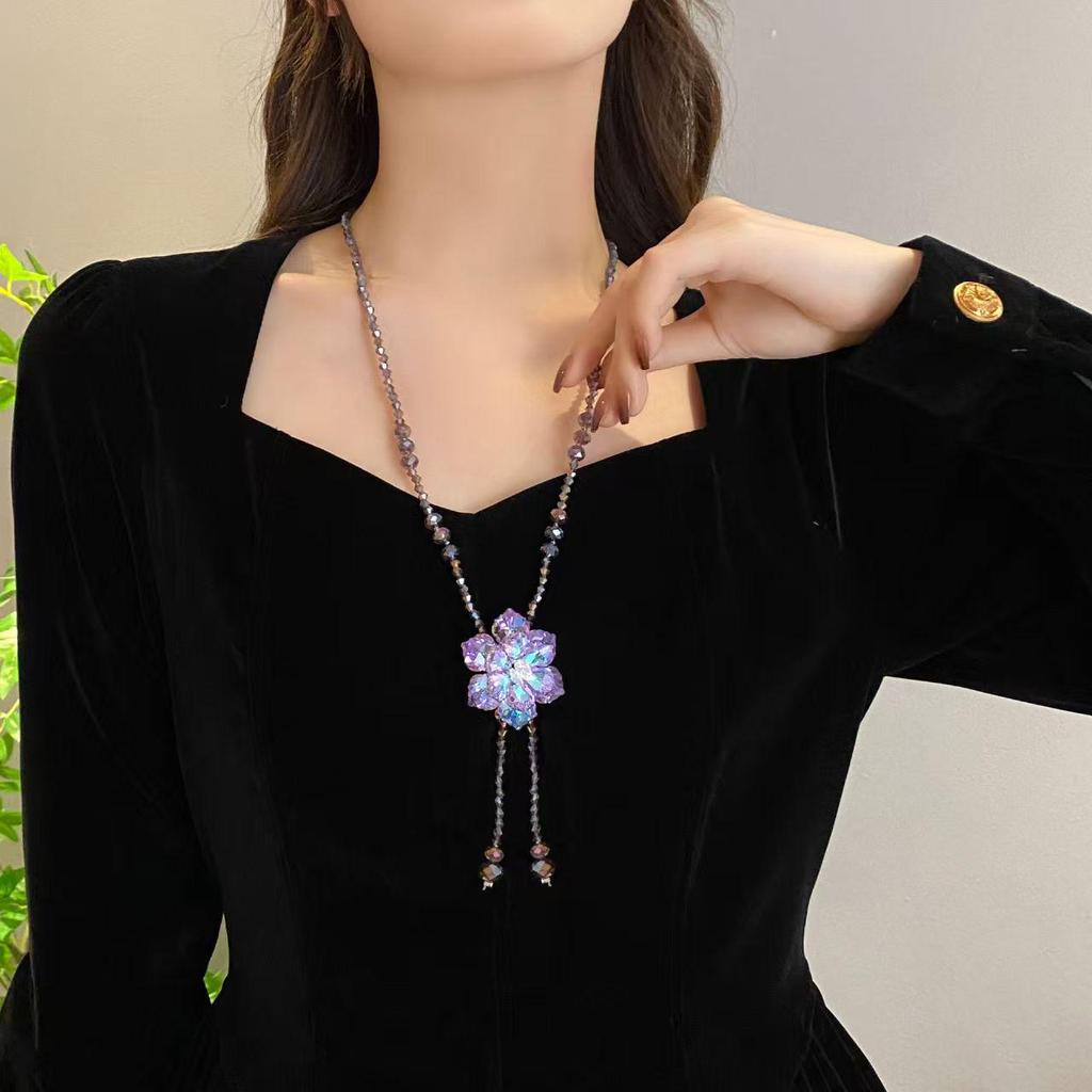Purple Crystal Flower Sweater Chain: Elegant Women's Long Necklace, New Chinese Style, Versatile Pendant Accessory