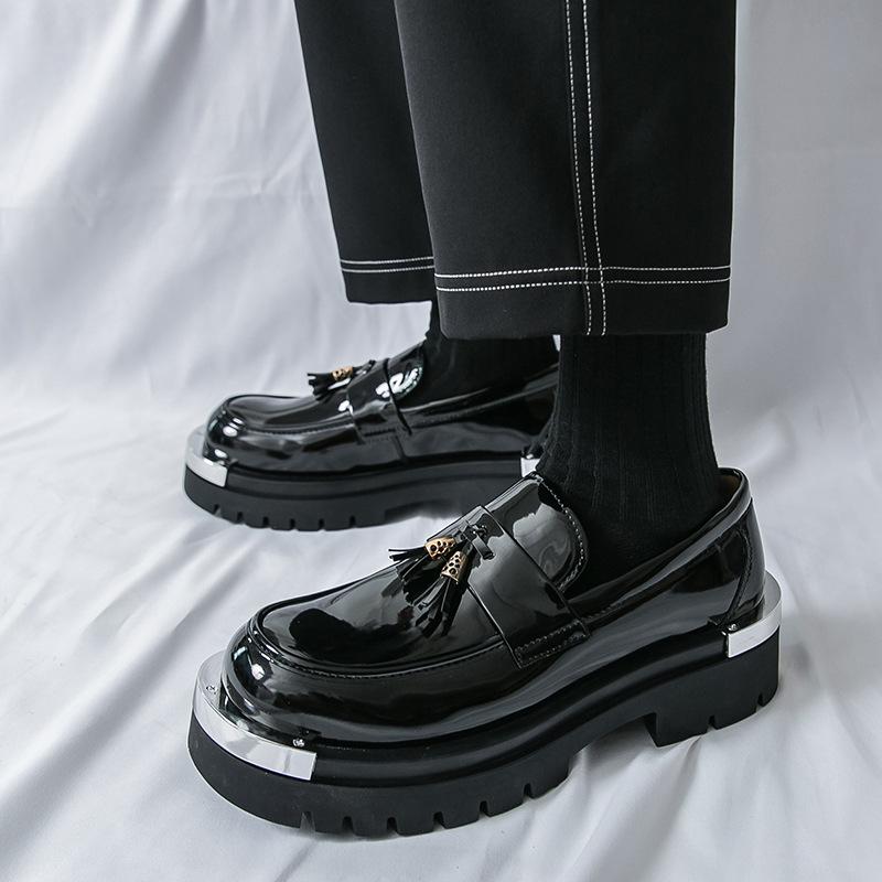 New Thick-soled Foot-fitting Fringed Men's Big-headed Leather Shoes Patent Leather Glossy Casual Loafers Hairstylist Trendy Shoes