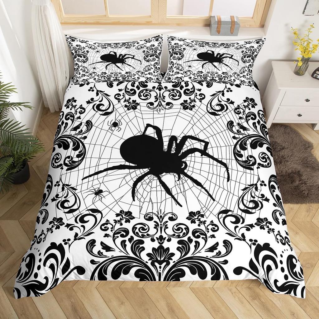 Black White Spider Web Duvet Cover Queen Halloween Gothic Bedding Set for Boys Adults Room Decor Hippie Floral Comforter Cover