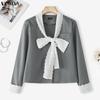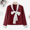 VONDA Women Casual Low Cut Neck Lace Bow Knot Long Sleeve Elegant Office Blouse