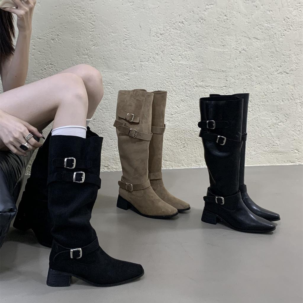 2025 Autumn and Winter Western Skinny Long Knight Boots Khaki High Heel Suede Pile Medium Boots Women's Boots