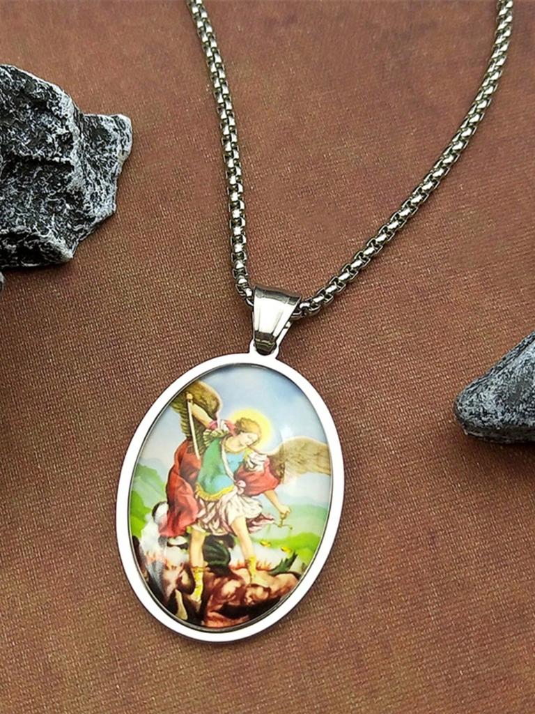 SAINT MICHAEL PROTECT US Archangel Glass Medal Pendant Necklace Women Men Stainless Steel Gold Color Christian Amulet Jewelry
