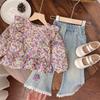 This stylish set for girls features a trendy floral shirt with long sleeves, crafted from soft corduroy for a comfortable fit. Paired with lace trim jeans, it offers a charming blend of fashion and functionality. Perfect for any occasion, this outfit is designed to keep your little one looking chic and feeling cozy all day long.