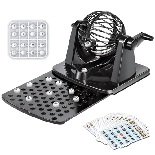 Bingo set (handle-operated lottery machine, cards, balls, tray): 1 machine, 20 cards, 75 balls, plastic, tray is integrated into the machine. *Colors may appear slightly different depending on your monitor settings.