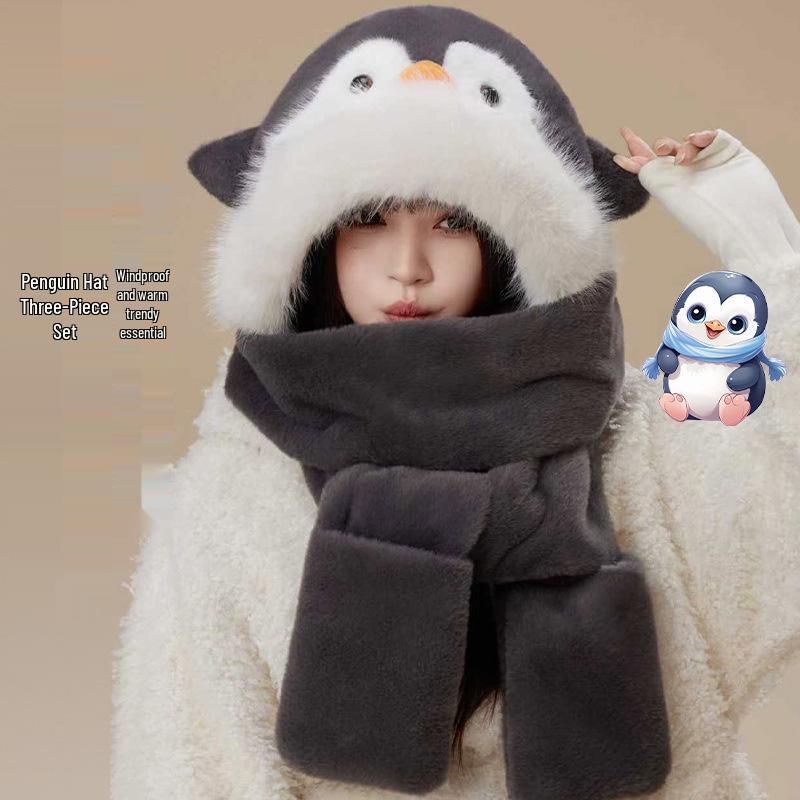 Penguin Ear Protection Hat, Scarf & Neck Warmer Women's 3-Piece Winter Set