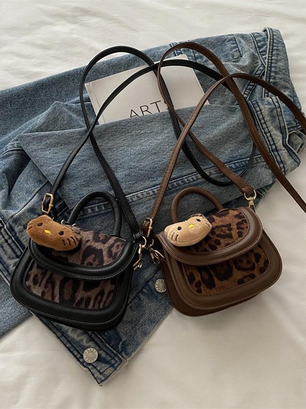 Korean Style Leopard Print Girls' Shoulder Bag - Cute Cat Design Fashionable Crossbody Handbag