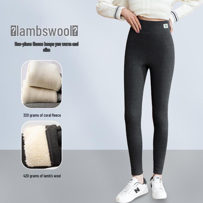 Women's High Waist Fleece-Lined Ribbed Leggings - Warm, Comfortable, Cotton, for Autumn and Winter Wear, Nine-Point Length.