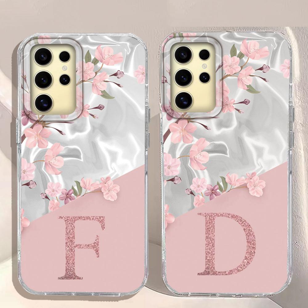 A Z Pink Letter Peach Flower ?Shockproof Phone Case For Samsung Galaxy S25 Edge S24 FE Plus Ultra Couple Silicone Fundas Cover
