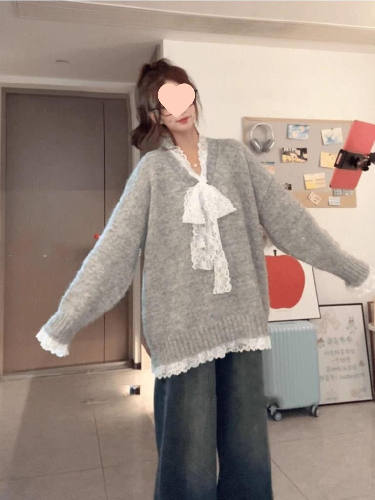 Grey Lace Long Sleeve Loose Knit Sweater - Spring/Autumn Design