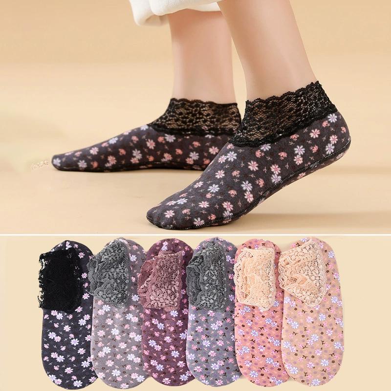 1 Pair Velvet Women Thermal Socks Autumn Winter Low Tube Warm Anti-slip Lace Trim Floor Socks