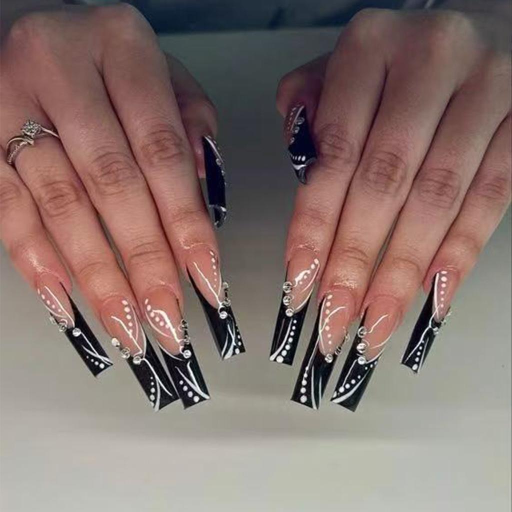 Black Press On Nails Long Coffin Glossy Full Cover Acrylic Long Square False Nails with Designs Artificial Fake Nails Glue Stick On Nails for Women