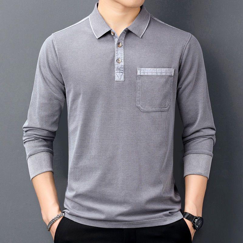 This men's long-sleeve polo shirt combines classic styling with modern comfort, featuring a solid pattern and a casual, loose fit. The turn-down collar and ribbed cuffs add a touch of sophistication, making it suitable for both casual and semi-formal occasions. Crafted from a polyester material with a chemical fiber blended fur, this shirt ensures durability and a soft, comfortable feel against the skin. A convenient pocket adds a functional detail to this versatile wardrobe staple.