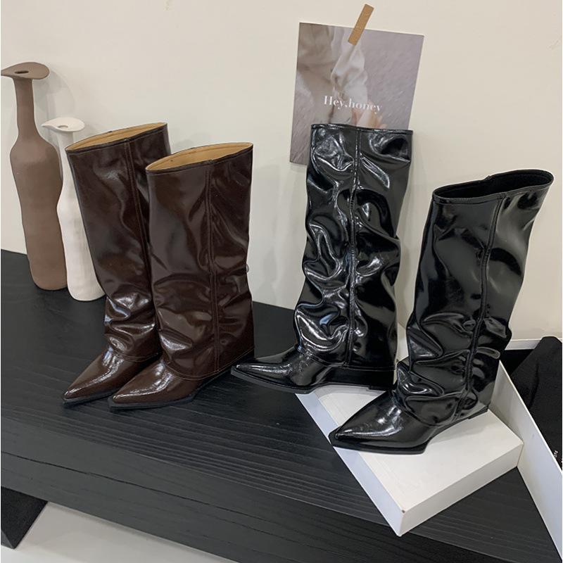 2025 New Patent Leather Knight Boots But Knee Boots Stacked Boots Retro Pointed Autumn and Winter Fashion