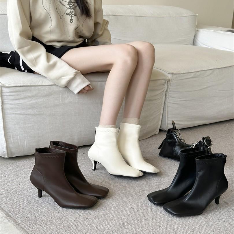 European and American Style Square Head Elastic and Thin High Heel Thin Heel Short Boots