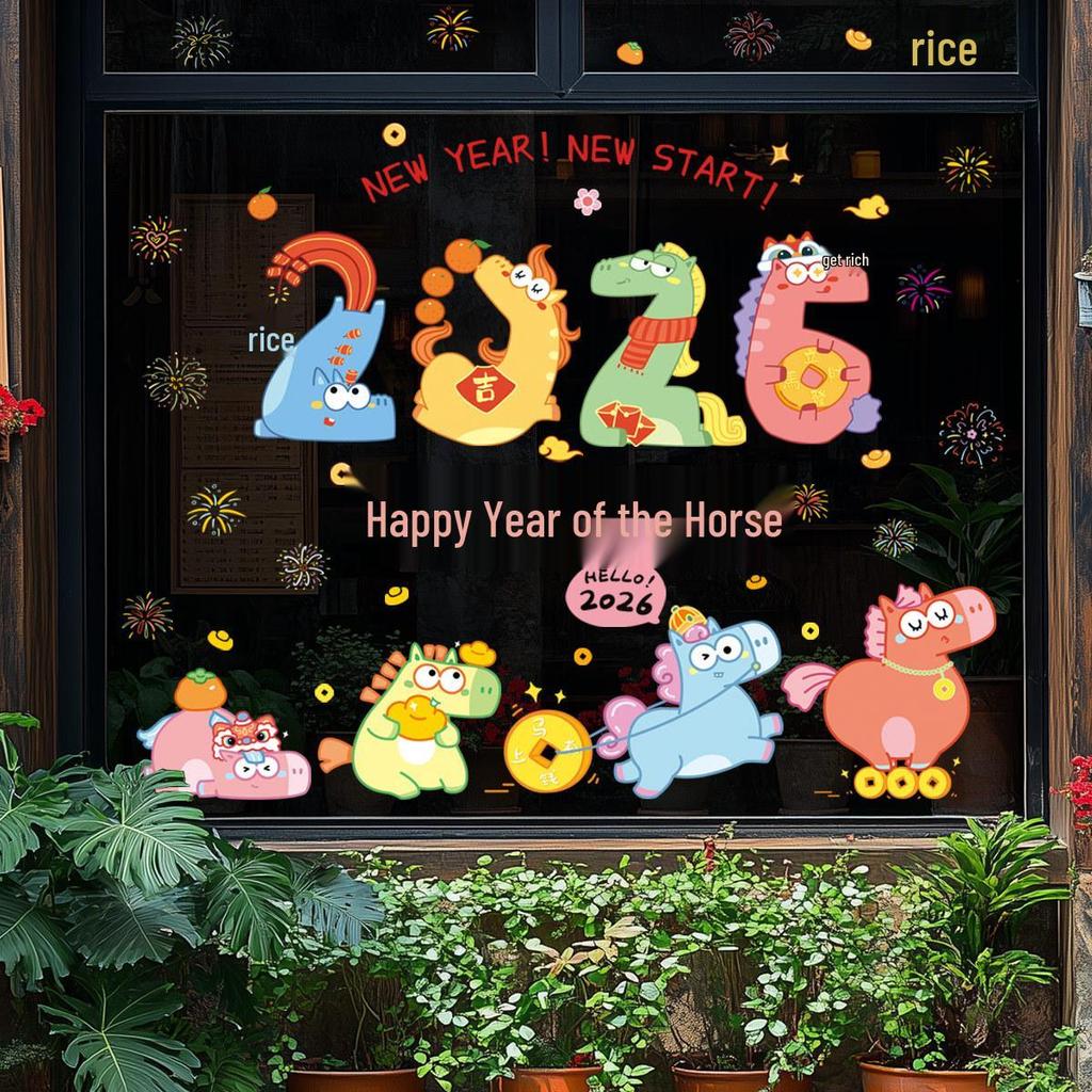 2026 Year of the Horse Cute Cartoon New Year Static Clings for Shopping Mall and Glass Door Decorations.