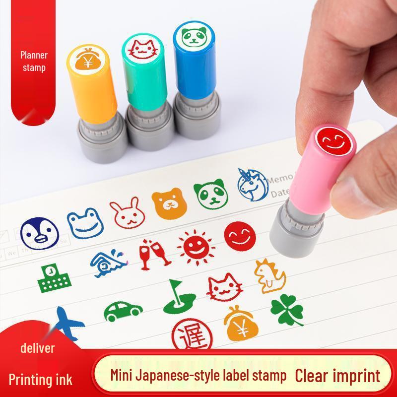 Set of 2 Cute Japanese Mini Stamps: Office Planner, Decorative Cartoon Stars, Smiley Faces, Red Flowers.