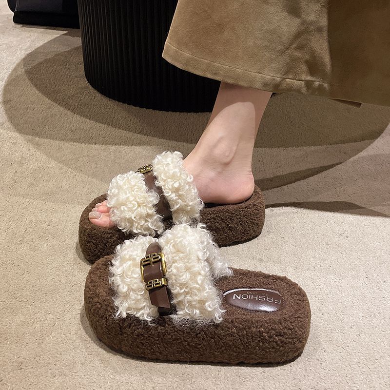 Super Hot Fur Slippers Autumn and Winter Women's Outerwear Internet Celebrity Curly Fur Belt Buckle New Platform Flip-flops To Show Skinny Fur Shoes