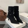 Temperament Skinny Pointed Heel Belt Buckle Pleated Stacking Boots Elastic Short Boots Women's Versatile Fashion Outer Fashion Boots