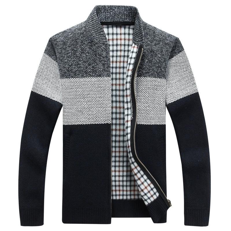 Men's Fall/Winter Long-Sleeve Fleece-Lined Knit Sweater Youthful Color-Blocked Warm Cardigan Jacket