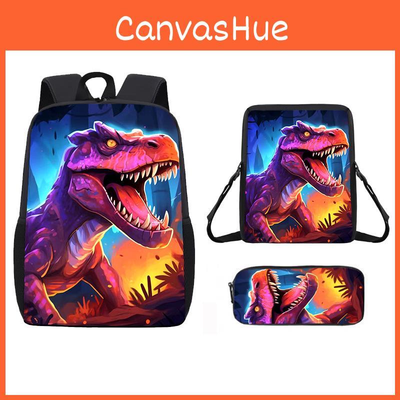 This children's backpack features a lightweight design with breathable oxford cloth material, measuring 17 inches in size. It supports daily school use with a padded air cushion strap system for comfortable carrying. The set includes a backpack, shoulder bag, and pencil case, all with playful dinosaur prints. Easy to clean with a damp cloth.
