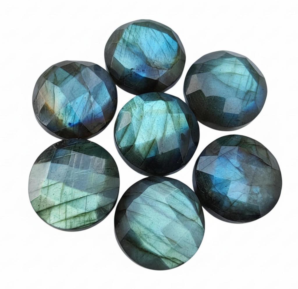 These Labradorite Round Gemstones feature the unique and sought-after Briolette Checker Cut, which creates a dazzling faceted pattern on the dome's surface for exceptional brilliance. Each round cabochon displays a vivid Multi-Color Flash (labradorescence), showcasing shifting hues of blue, green, gold, and sometimes purple as the stone moves. Available in All Sizes, this distinctive cut combined with the mesmerizing internal fire makes them ideal for creating dynamic, high-end pieces like sparkling drop earrings, intricate bracelets, and captivating pendants for the discerning jewelry maker.