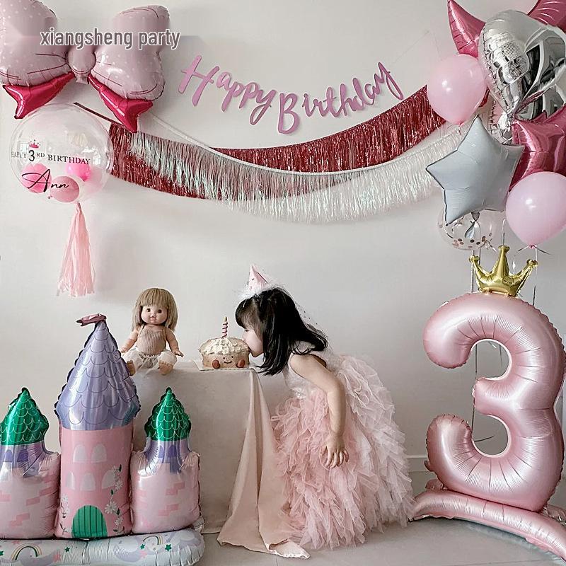 Pink 3rd Birthday Decoration Set for Girls - Tassel, Flag Banners, and Number Balloons