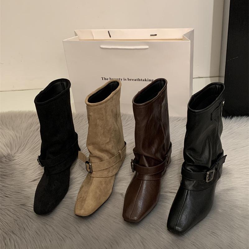 Vintage Suede Khaki Boots Women's Boots French Boots Fall Niche Design Western Stack Boots Knight Boots