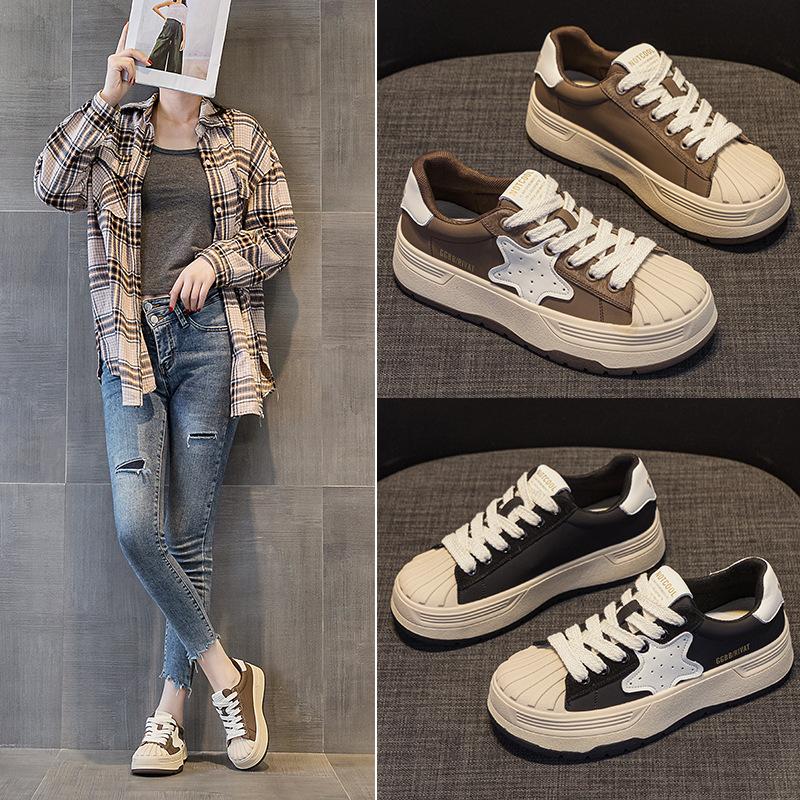 Leather Platform Biscuit Shoes Shell Head White Shoes Women's Velvet New Four-season Women's Shoes Versatile Sports and Leisure Board Shoes