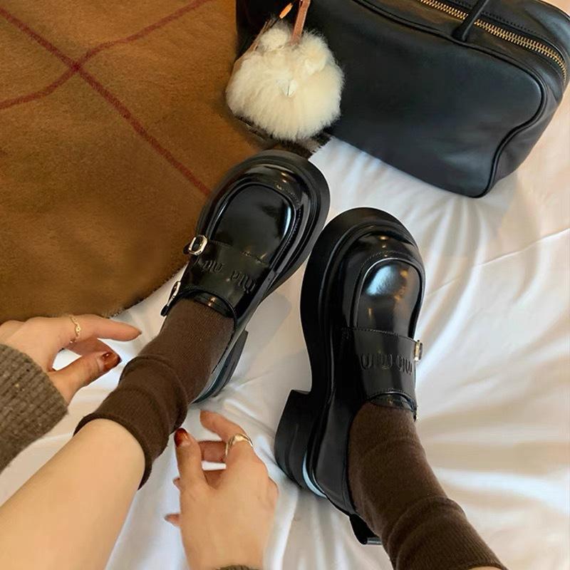 Genuine Leather Amiu's Double Buckle with Round Head British Style JK Small Leather Shoes Platform Thick Heel Loafers Women's Single Shoes Women