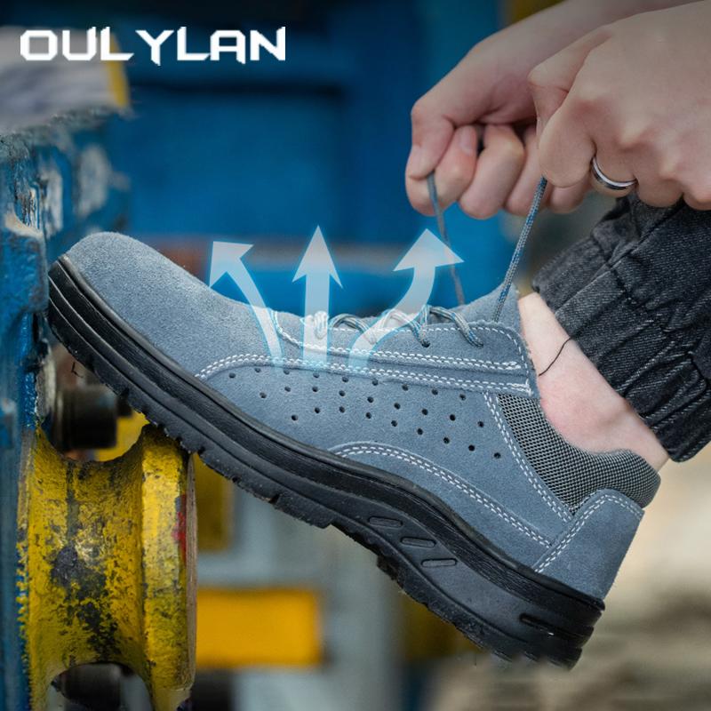 Oulylan Male Breathable Cowhide Safety Shoes Welder Anti-Smash Work Footwear Men Wear Resistant Shoe Steel Toe Security Sneakers