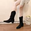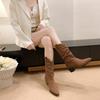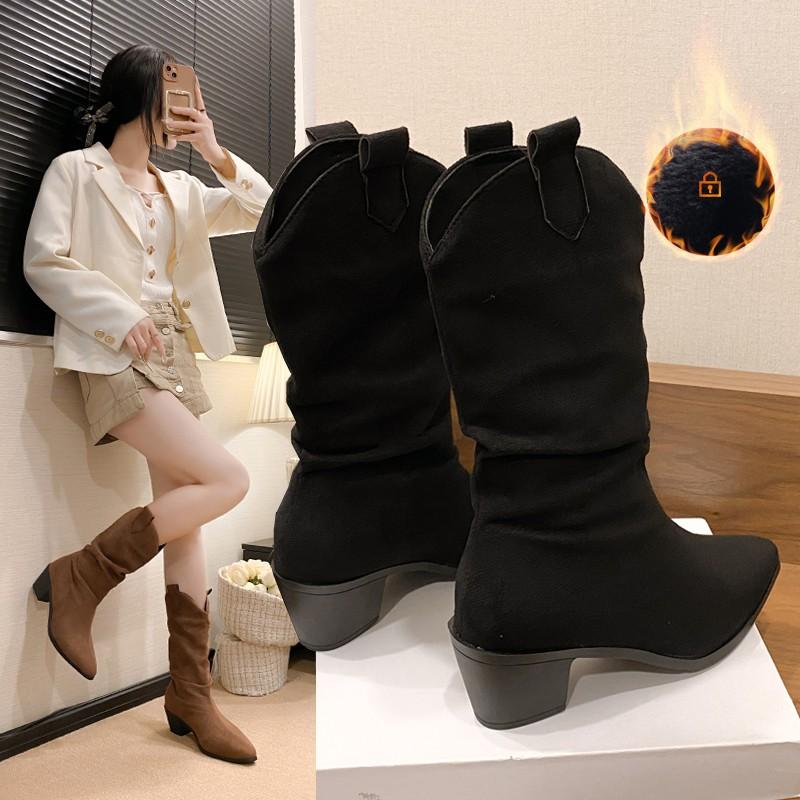 New Style High Heels Mid Calf Pleated Boots for Women Autumn Winter Brown Leather Western Boots Woman Thick Heeled Cowgirl Boots