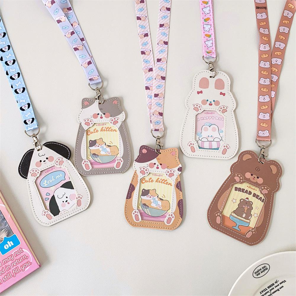 Cartoon Cat Transparent Durable Card Holder with Lanyard for ID, Bus, Meal Cards