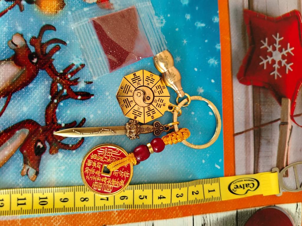 Brass Tai Chi Keychain with Seven Star Sword, Five Elements Bagua Plate, and Small Gourd Mascot
