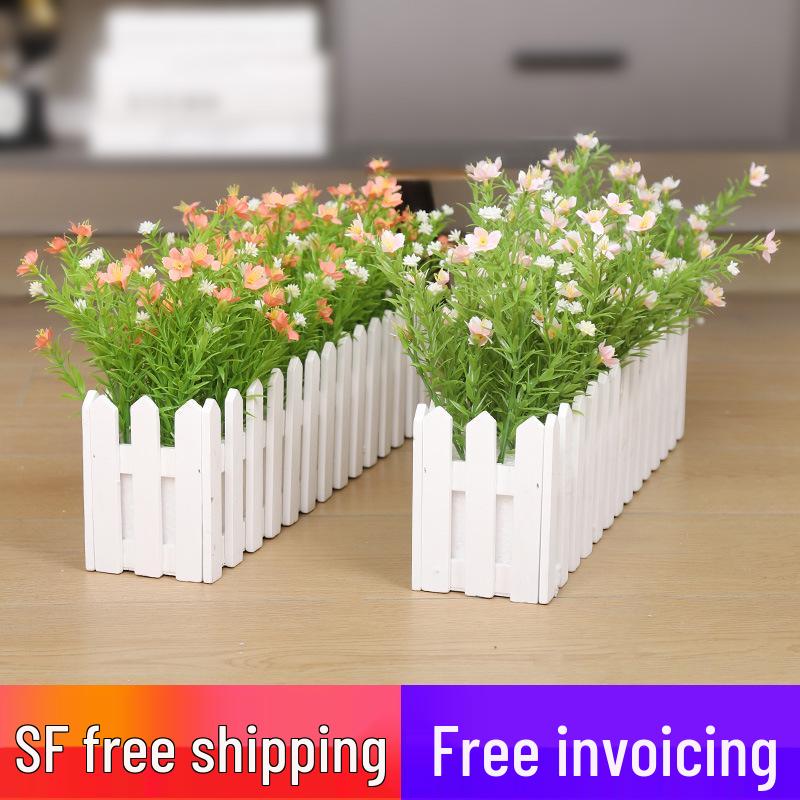 Silk Flower Pot with Wood Fence: Decorative Bonsai for Living Room or Office.